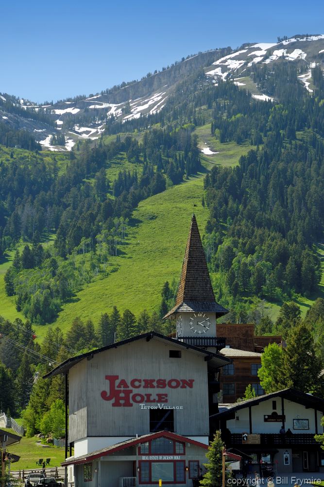 clock tower Jackson Hole Wyoming USAKeywords: 900-01014660, alpine, American, American (places and things), architecture, Bill Frymire, blue sky, building, building (structure), clear sky, clock, clock tower, day, exterior, green, hill, hillside, holiday, Jackson Hole, landscape, lodge, mountain, mountain range, mountain side, nobody, North America, off-season, picturesque, quaint, resort, Rocky Mountains, Rocky Mountain States, scenic, season, season (division of year), ski hill, ski resort, ski trail, sky, snow capped, steeple, structure, summer, Teton Village, tourist attraction, tower, tower clock, travel, travel (destination), travelling, tree, USA, vacation, valley, Wyoming |