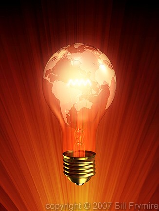 Clear incandescent light bulb with a world map imposed on it. think globally |